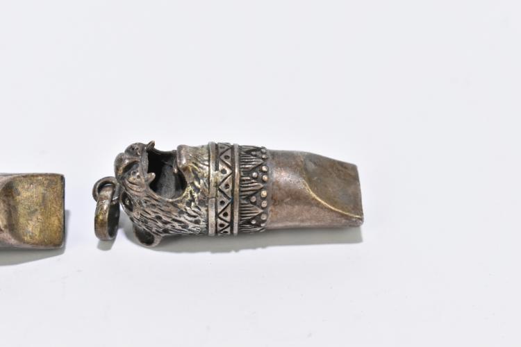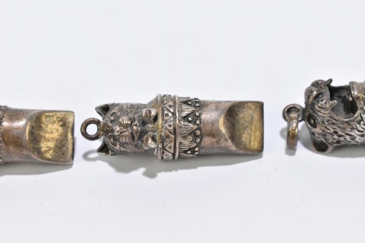 Lot 1070 of 2131: Three novelty sterling silver whistles, two modelled with kitten's head, the third modelled with a leopard head, each with ring loop attachments, length approx 37mm and 35mm (3).