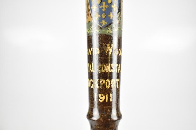 Lot 1078 of 2131: A George V policeman's truncheon for 'David Wood, Special Constable, Stockport 1911', with gilt GR cypher, crown and armorial, length 38.5cm.