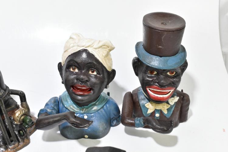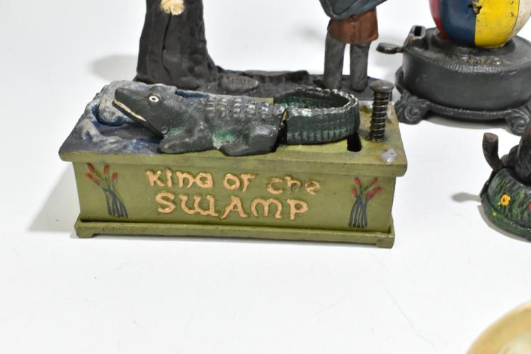 Lot 1081 of 2131: Ten reproduction American style cast iron money banks, various examples including Casting bank, Full Service bank, King of the Swamp, etc (10).