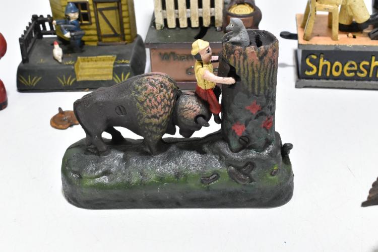 Lot 1083 of 2131: Six reproduction American style cast iron mechanical money banks, various examples including Shoe Shine bank, Professor Pug Frog, Great Bicycle Feet, etc (6).