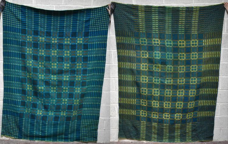 Lot 1085 of 2131: A Welsh wool blanket decorated with a geometric pattern in shades of yellow and turquoise, 226 x 169cm, stitch repaired section to the centre, together with seven wicker baskets, the largest twin handled rectangular example height 43cm, width 84cm, a wicker female torso, and ash wash dolly.