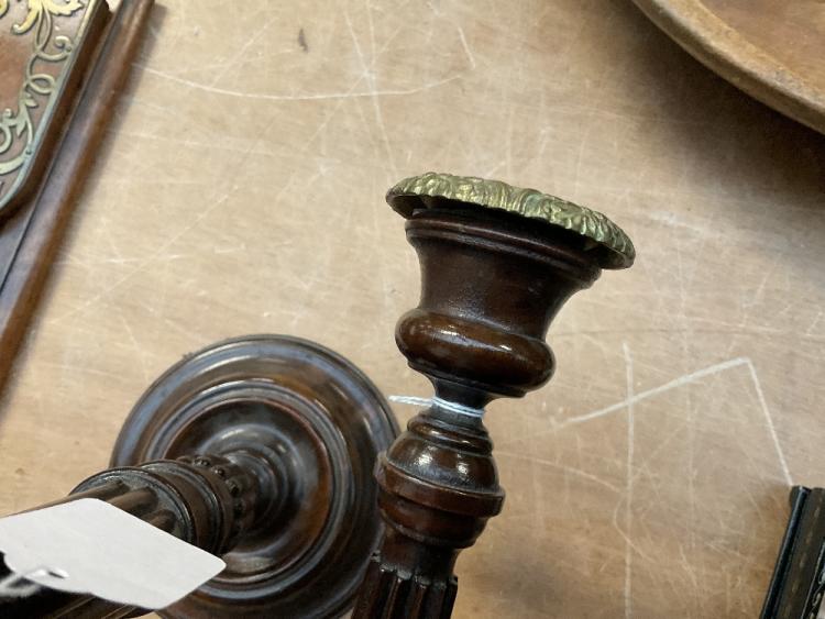 Lot 1088 of 2131: A pair of Edwardian walnut candlesticks, each with detachable brass sconce above fluted turned central column to dished circular base, height 35cm.