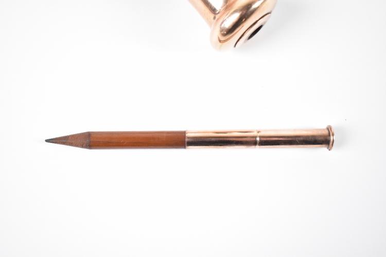 Lot 1094 of 2131: An Edwardian gadget walking cane with tapering rosewood shaft and 9ct yellow gold mount set with a pencil to the cap and inscribed 'J.Downing', length 91cm.