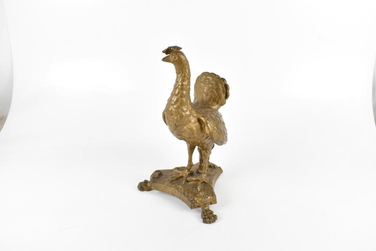 Lot 1117 of 2131: A Continental base metal model of a dancing bear, height 38cm, with a Continental gilt metal figure of an emu and a large one of a cockerel (3).