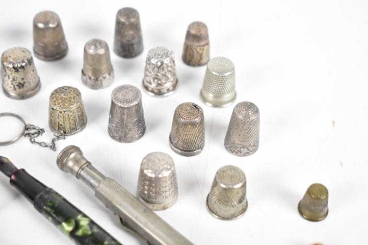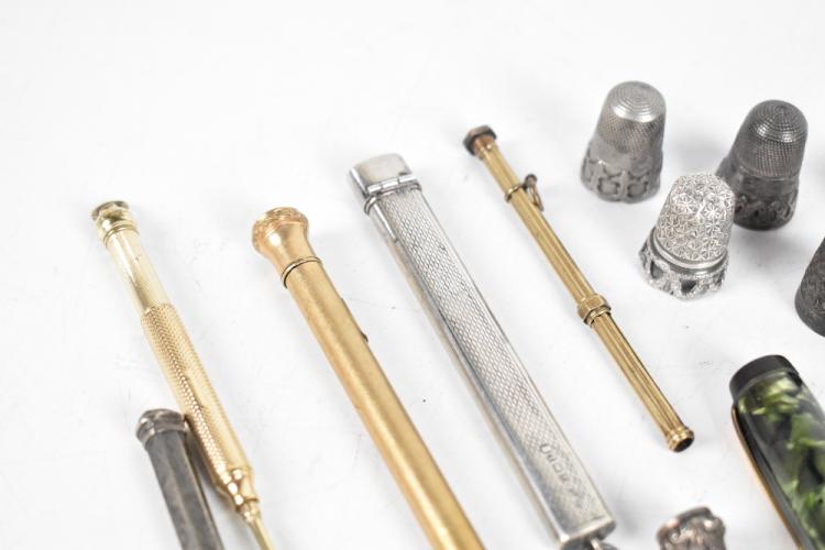 Lot 1122 of 2131: Eight assorted propelling pencils and one pen, including three white metal examples, a pull action gold plated example with engine turned decoration, a hallmarked silver pencil case, a pair of 15ct yellow gold cufflinks, grouping of thimbles, including four hallmarked silver examples, etc, weight of cufflinks approx. 4g (part af).