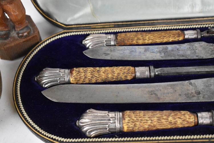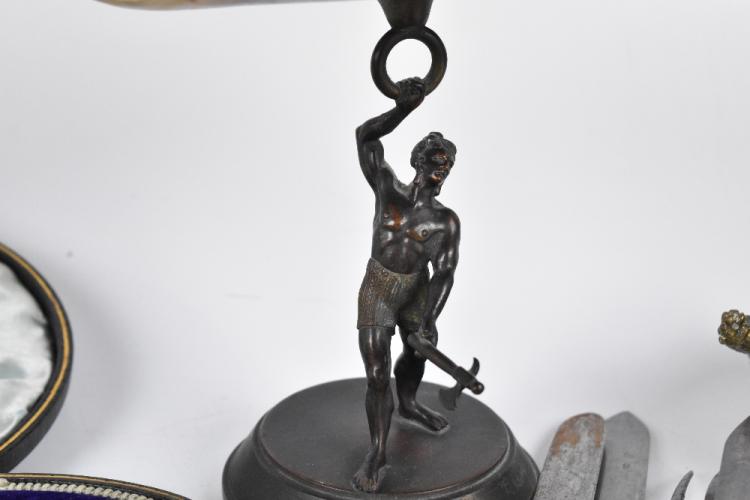 Lot 1124 of 2131: A miscellany of collectors' items, including a bronzed comport with mother of pearl bowl supported by a soldier, height 20cm, a pair of Black Forest type plates and similar figure, assorted brass ware including eastern model of a cow, various carving sets.
