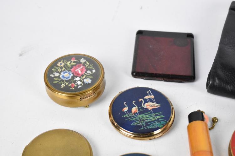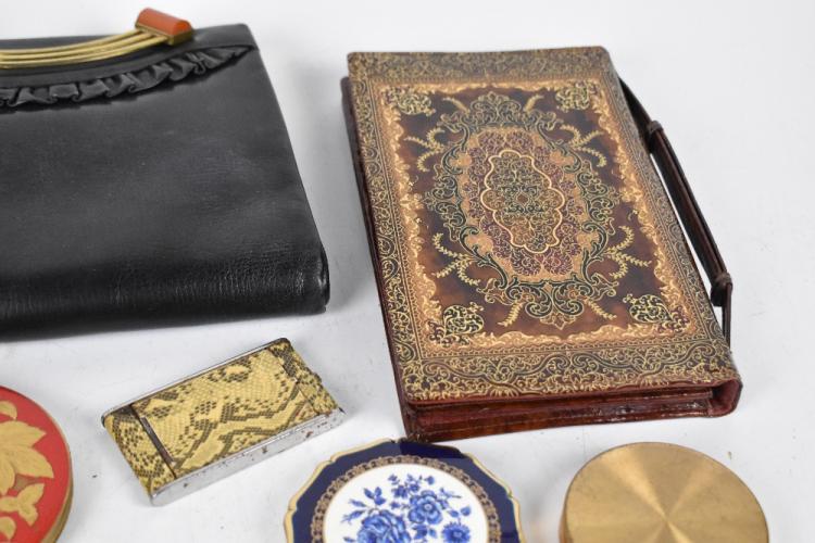 Lot 1130 of 2131: A grouping of assorted vintage lady's compacts including an Art Deco example with engine turned decoration, an amber effect cylindrical example, also two lady's handbags.
