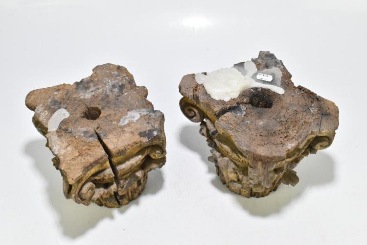 Lot 1133 of 2131: A pair of 18th century carved and parcel gilt wood Corinthian column capitals, height 19.5cm (2).