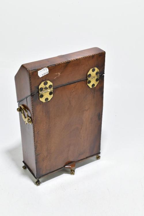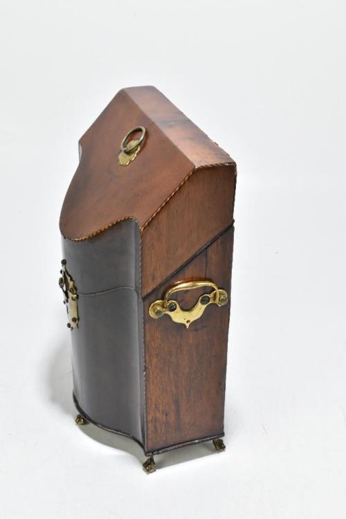 Lot 1134 of 2131: A late George III serpentine mahogany knife box, with checkered inlay and brass escutcheon handles and claw and ball feet, the interior converted to a stationery box, height 33cm.
