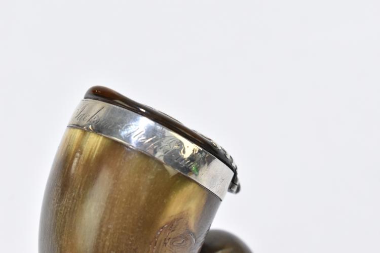Lot 1137 of 2131: A Victorian hallmarked silver mounted coromandel wood cylindrical box and cover, London 1867, height 9cm, with a 19th century Scottish white metal mounted horn snuff mull engraved 'David Jackson, nether-saw' (2).