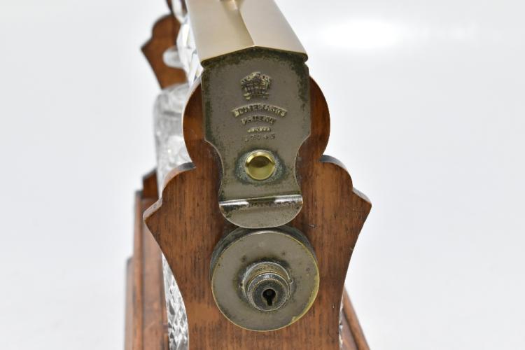 Lot 1141 of 2131: BETJEMANN'S; a patent silver plate mounted oak three division tantalus, number 17743, height 28cm.