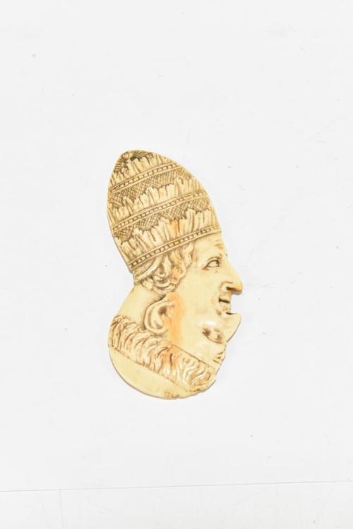 Lot 1164 of 2131: An unusual 19th century ivory double sided and four faced token carved to one side with the profile of a cardinal and a monk and with a bishop and pauper to the reverse, length 9.5cm.