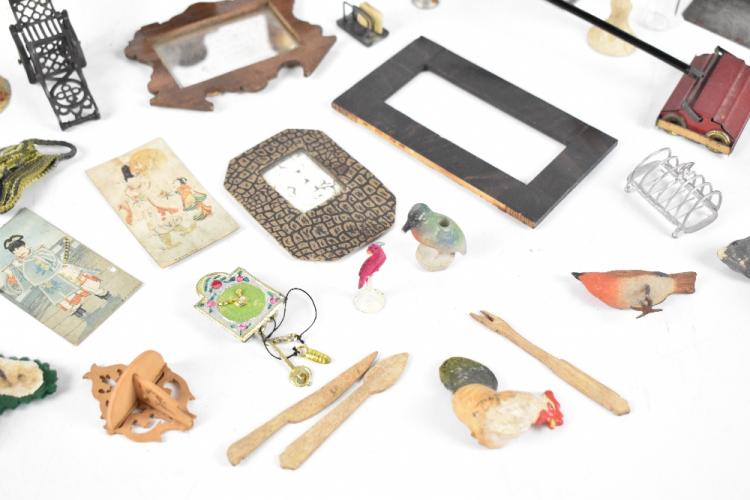 Lot 1178 of 2131: A collection of wood, metal and other dolls' house furniture and accessories to include and four poster bed, a serpentine sideboard, an invalid chair, a faux tiger skin rug, chairs, various bird models, Tondo pictures, etc.