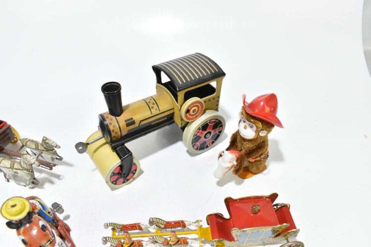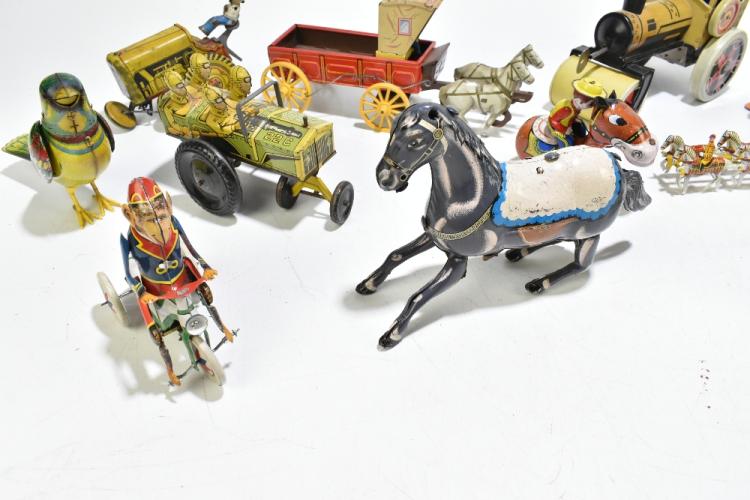 Lot 1226 of 2131: A group of assorted clockwork and tin plate toys including American style horse drawn wagon, a Mar Toys Jumping Jeep, musical birds, etc (12).