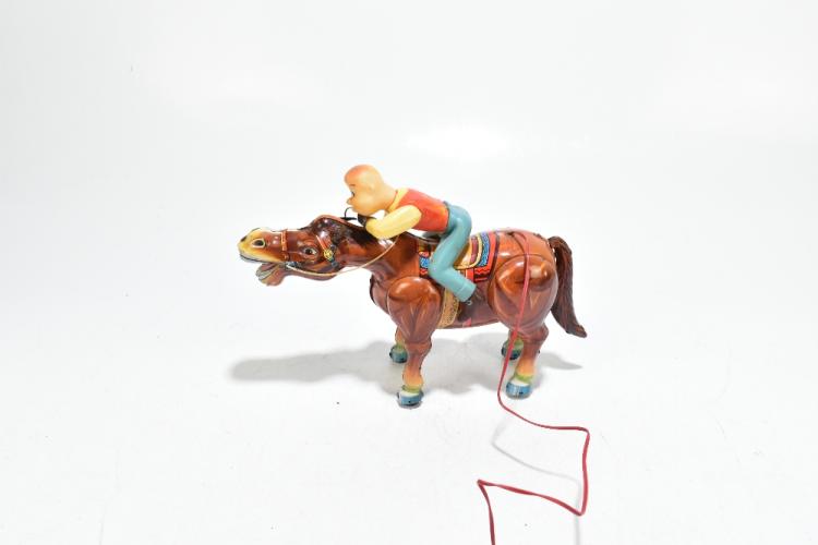Lot 1233 of 2131: A group of tin plate battery operated figures, including a Daya Japanese horse drawn coach entitled Stagecoach, also a tin plate American style Western shop (5).