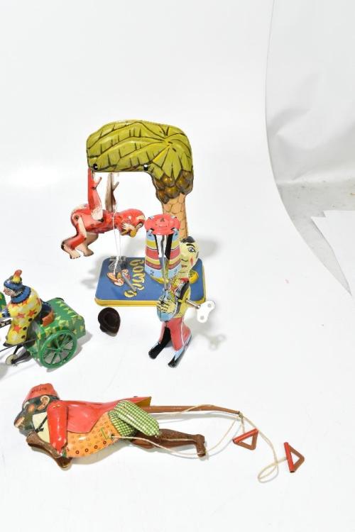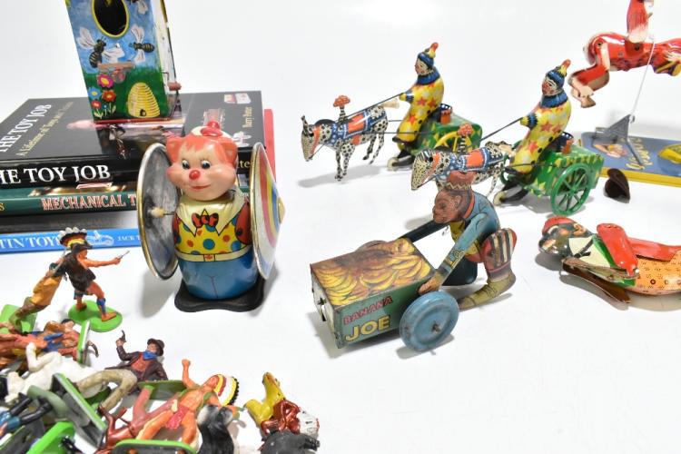 Lot 1235 of 2131: An group of assorted toys including clockwork tin plate models, two examples of clowns on horseback, a Daya Circus ChooChoo Train, assorted Britain's Soldiers, also three hardback books on toys, including Collecting Toys by Jack Tempest.