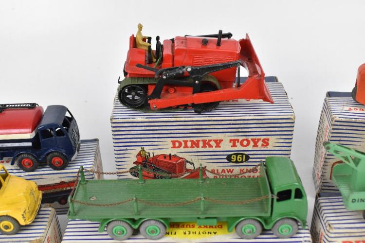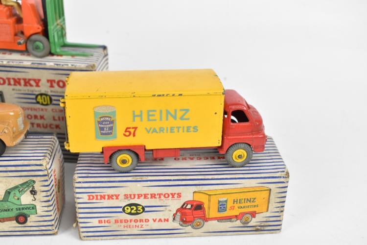 Lot 1274 of 2131: DINKY; seven boxed diecast vehicles comprising 961 Blaw Knox bulldozer, 401 Coventry Climax forklift truck, 942 Foden 14-ton tanker, 933 Leyland cement wagon, 923 big Bedford van 'Heinz', 430 breakdown lorry and 905 Foden flat truck with chains (7).