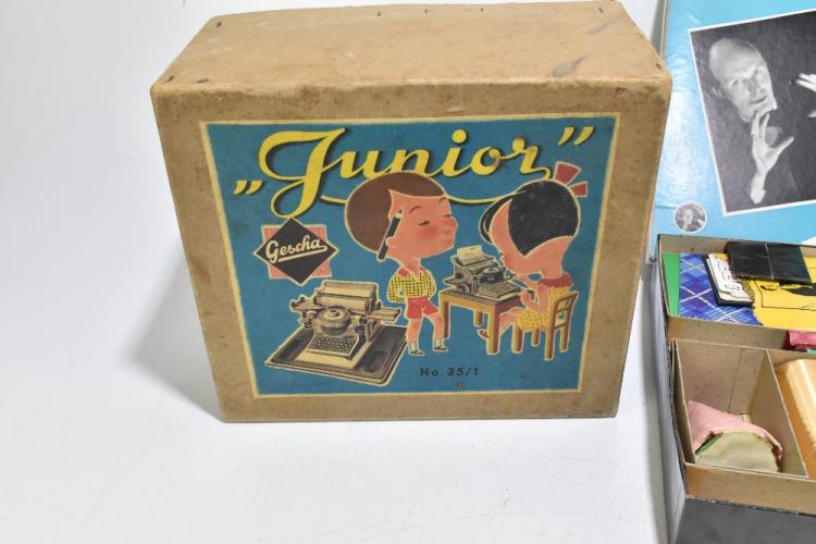 Lot 1300 of 2131: GESCHA; a West German tinplate child’s ‘Junior’ typewriter, in original box, together with a David Nixon Super Magic Box (2).