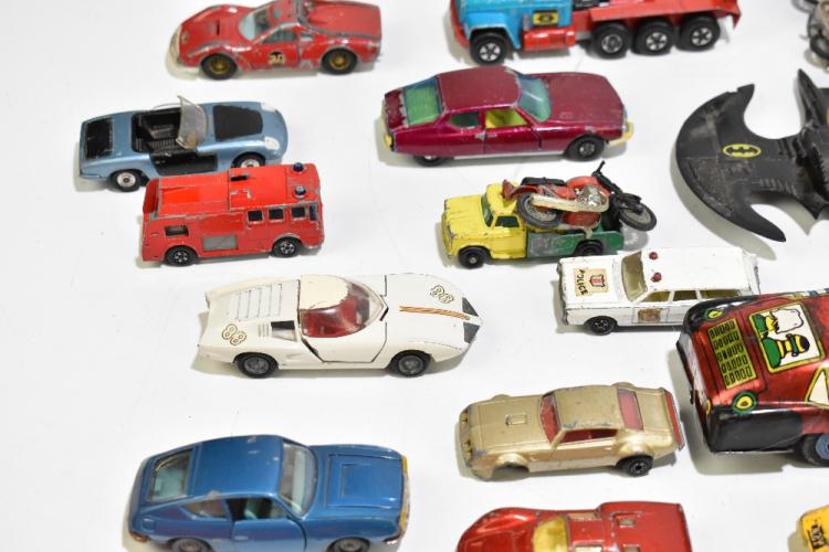 Lot 1313 of 2131: A small selection of play worn Corgi and other toys to include a clockwork Rosey Toys tin plate car.