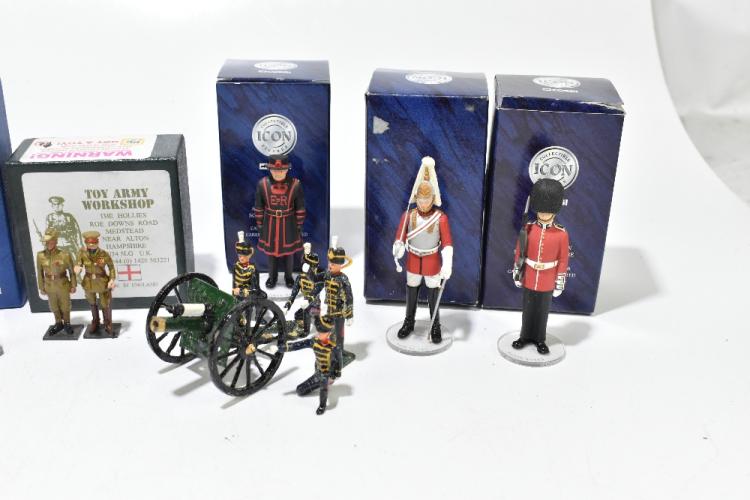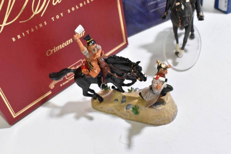 Lot 1323 of 2131: BRTAIN'S; special collectors' edition Crimean War, Butcher Jack, number 00263, with two Ducal traditional military figures, Trooper of the Life Guards and 17th Duke of Cambridge's Own Lancers, Elfin models of Wales, Big Gun plus Four Man Crew set, Toy Army Workshop BS86 Gurkha, a smaller Ducal Models Trooper of the Life Guards and four Corgi Icon figures, a larger Mounted Blues and Royals (10).