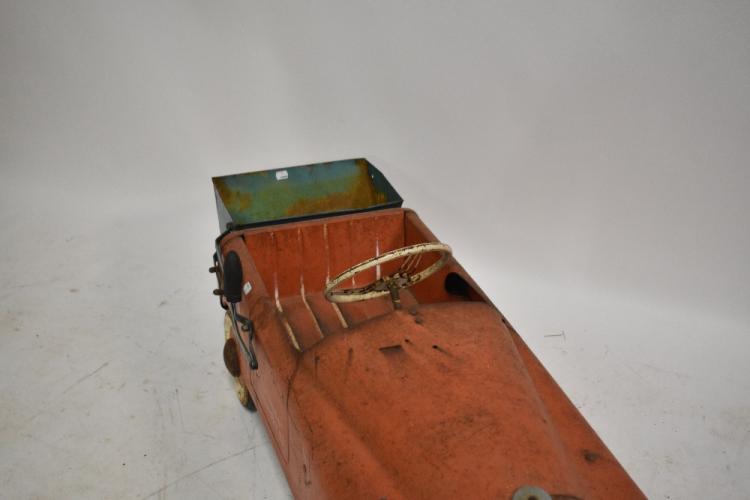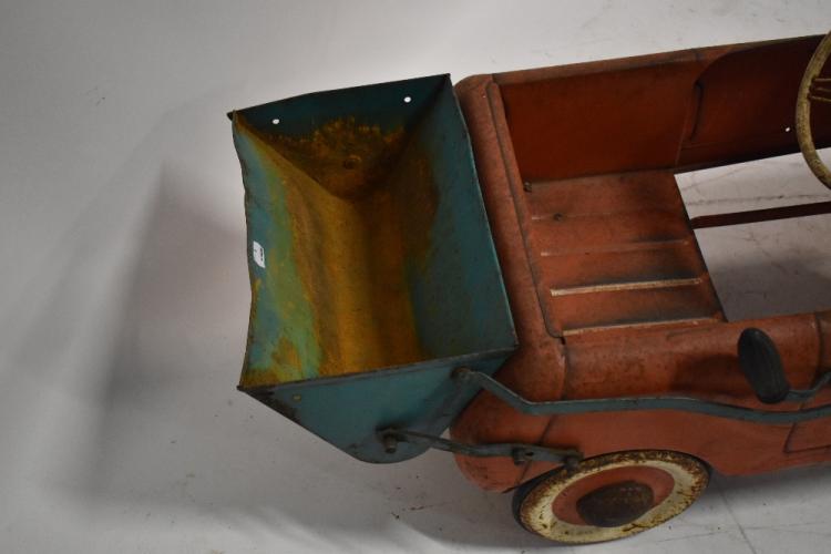 Lot 1331 of 2131: TRI-ANG; a rare Tri-ang Commercial pressed steel child’s pedal Tipper Truck, English 1950s, red painted body, cast steering wheel with metal spoke centre, rear metal box with hand mechanism lever, balloon wheels with hubcaps and front bumper and grill, length 119cm.