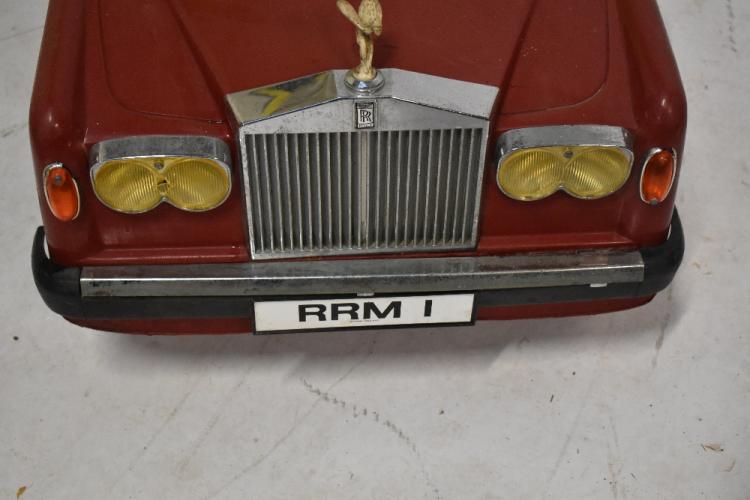 Lot 1334 of 2131: ROLLS ROYCE; Tri-ang moulded plastic Rolls Royce Sharma RRM 1 child’s battery operated electric car, English 1989, finished in red with moulded plastic seat and steering wheel, wooden effect dashboard, chrome plastic grill with RR emblem and plastic Spirit of Ecstasy mascot, electric headlights and indicators (untested), solid plastic wheels with RR hub caps and plastic tyres, windscreen with Tax disc dated 31.12.89, length 122cm.