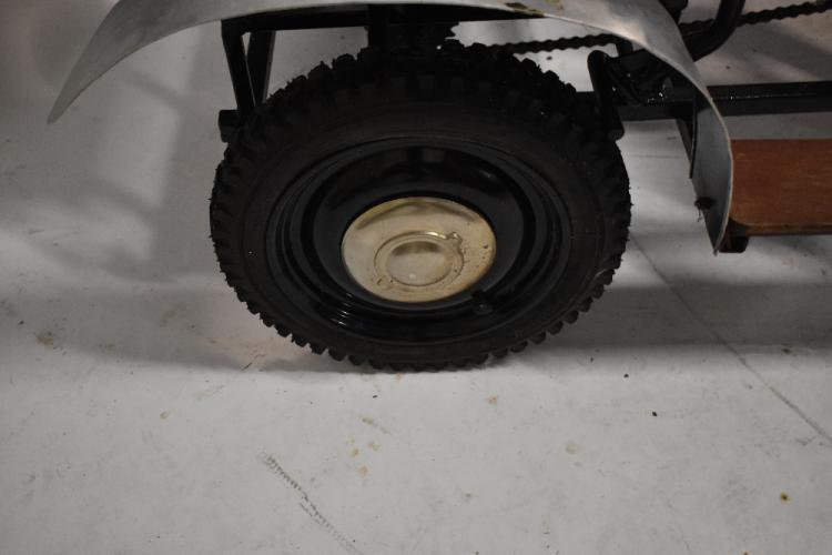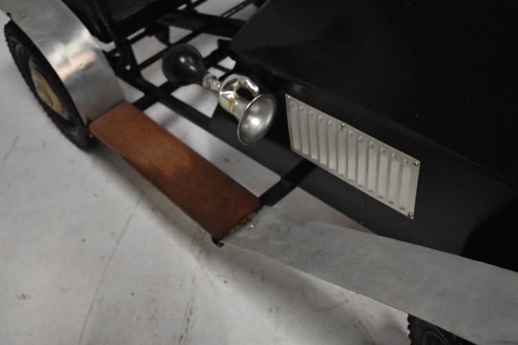 Lot 1335 of 2131: DAVINA; a Merlin vintage Davina Roadster child’s chain driven pedal car, English 1990s, black painted aluminium body with padded seat, silver mud guards with front headlights and wooden foot plates, wooden steering wheel and front grill with brass trim and nameplate ‘Davina’, crank handle, working horn, working brake handle and rear metal luggage box, pressed steel wheel hubs and pneumatic tyres, length 150cm.