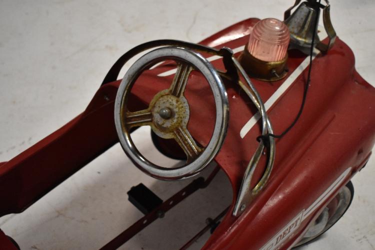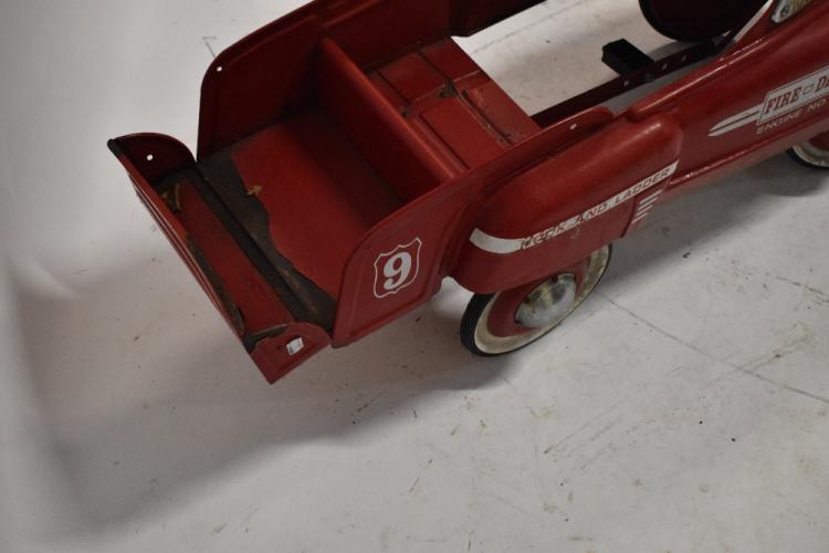 Lot 1336 of 2131: A Murry pressed steel child’s pedal Fire Dept Engine, American circa 1980, painted in red with white bonnet lines and Fire Dept, Engine No.9 transfers to side, silver painted front grill and lights, chrome Fire Dept helmet bell and light to bonnet, chrome steering wheel and windscreen, pressed steel wheel hubs with chrome hub caps and solid rubber tyres, length 108cm.