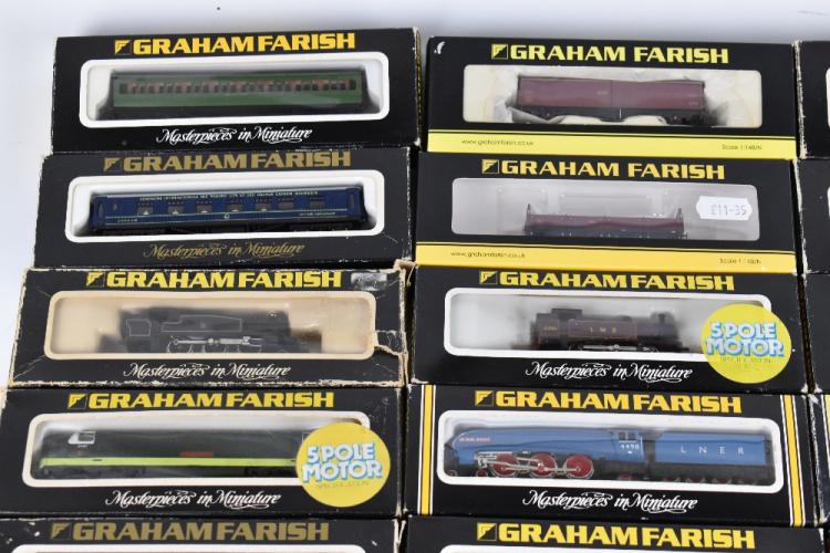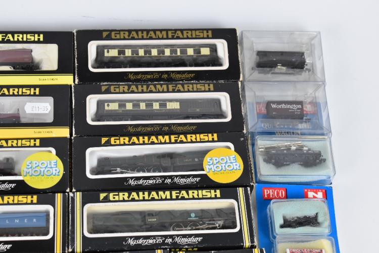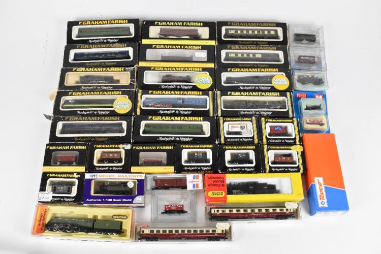Lot 1347 of 2131: GRAHAM FARISH; a collection of N Gauge locos and accessories to include six engines, numbers 1404 Hall Class GWR, 1606 Prairie Tank BR, 8414 Royll But Highlander, 1862 Sir Nigel Gresley LNER, 1515 602 Squadron BR and 1701 general purpose tank, with various carriages and other Horby and other make N Gauge accessories (qty).