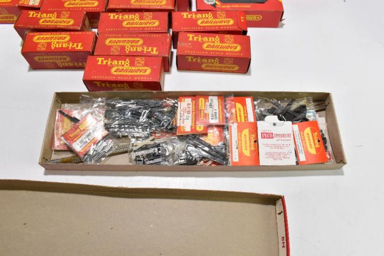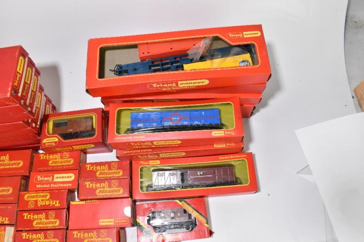Lot 1350 of 2131: TRI-ANG HORNBY; a collection of 00 Gauge carriages and wagons comprising eight R.418 Centenary extension packs, an R677 B.R freightliner wagon, an R.634 freightliner wagon, an R.740 coach for breakdown crane crew, an R.678 freight wagon, an R.634 freight wagon, an R738 Anglo-Continental ferry van, an R741 Transfesa ferry van, an R.563 Bogie bolster wagon, an R738 Anglo-Continental ferry van, an R.107 L.M.S break van, an R.300 Track masts and another similar, an R.107 L.M.S break van, an R.124 br