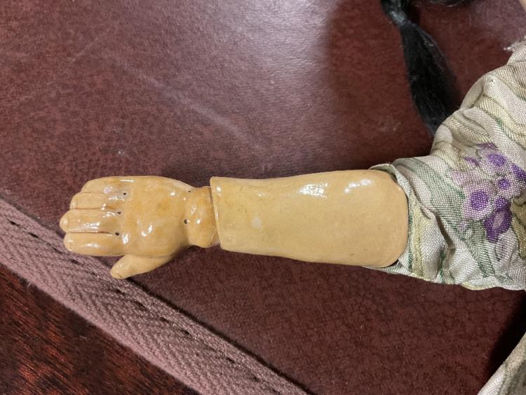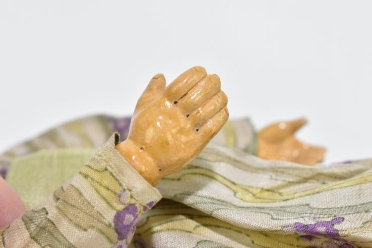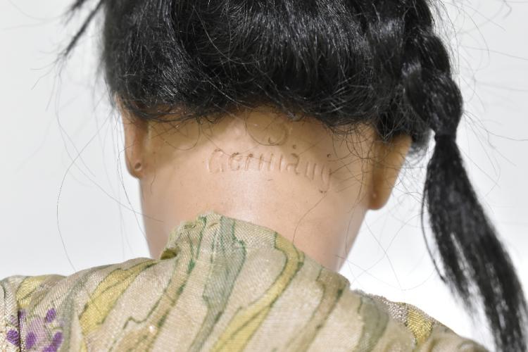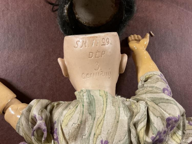 Lot 1366 of 2131: SIMON & HALBIG; a bisque head Oriental doll, with sleeping eyes, open mouth with visible teeth and jointed composition body, mould number three, in patterned green dress, length 30cm.