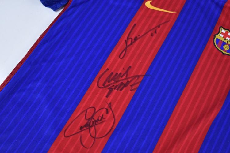 Lot 1390 of 2131: BARCELONA; a Nike Barcelona home shirt, signed by Messi, Suarez and Neymar to the front, size large.