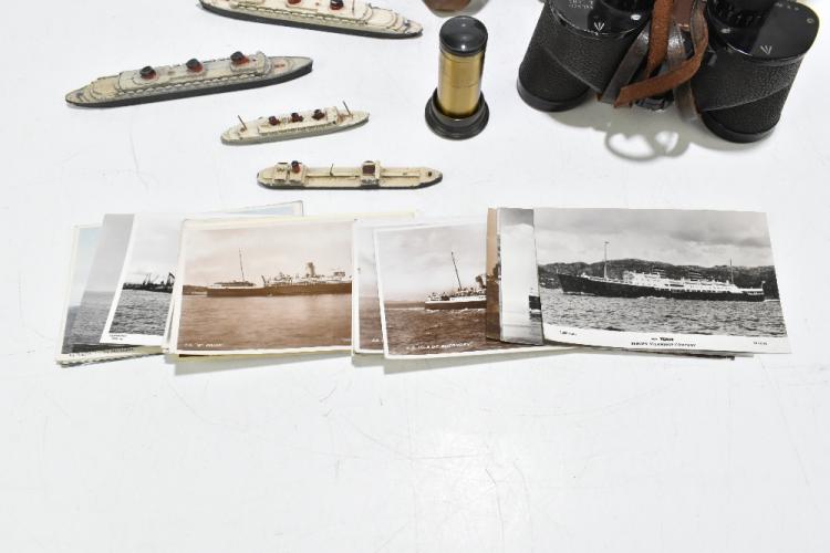 Lot 1430 of 2131: BAUSCH AND LOMB; a pair of American military 6x30 mk1 binoculars, with broad arrow stamp, cased, together with a cased military lens, three Dinky ship's models and a small quantity of postcards depicting various boats and ships.