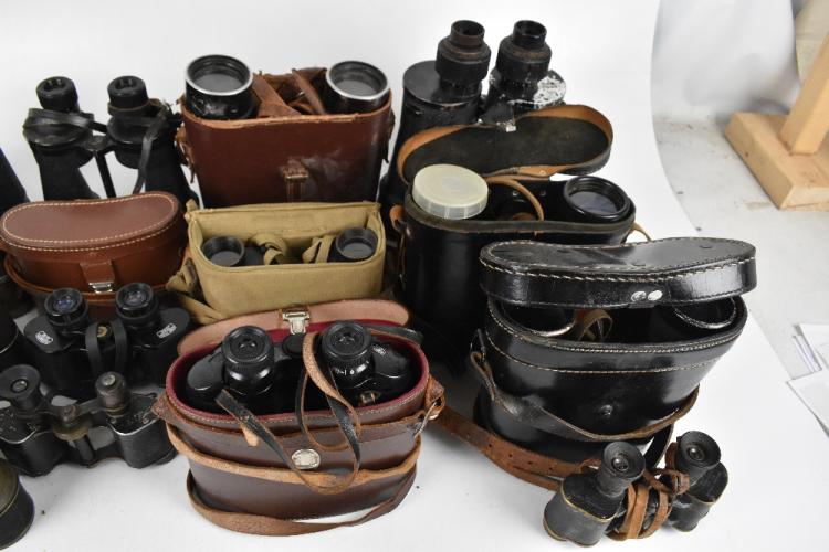 Lot 1443 of 2131: A large quantity of binoculars including two pairs of Dienstglas 7 x 50 Leitz examples, Carl Zeiss Deltrintem 8 x 30 binoculars, etc, many with associated cases.