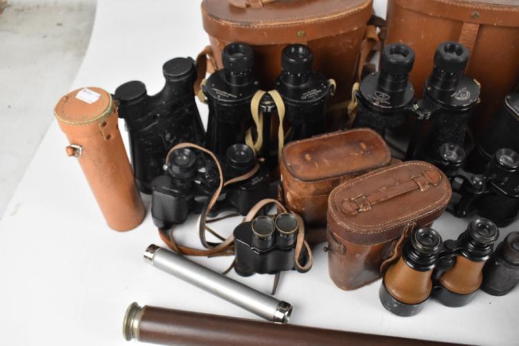 Lot 1444 of 2131: A large quantity of binoculars including a pair of Mk2 Bino Prism no.5 x 7, a pair of Leitz Dienstglas 7 x 50 binoculars and simple single drawer telescope, etc.