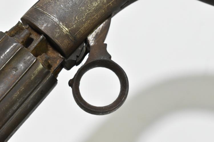 Lot 1445 of 2131: A late 18th/early 19th century six shot pepper box revolver with sliding thumb catch safety and engraved metalware inscribed J.R.Cooper patent and with walnut stock, length 20cm.