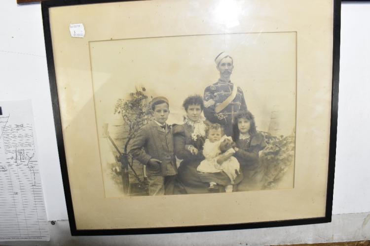 Lot 1447 of 2131: CAPTAIN PERCY WILLIAMS (died 1876); watercolour after John Fennelly depicting hunt scene, 17 x 21.5cm, with three military photographs including a figure seated holding a copper horn, also included in this lot is a copper horn by Boosey & Co of London, numbered 12619 (6).