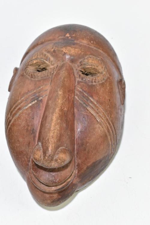 Lot 1463 of 2131: An African tribal mask with exaggerated ears, possibly Yaruba, height 39cm and a further tribal mask with pronounced nose, length 26.5cm.