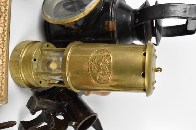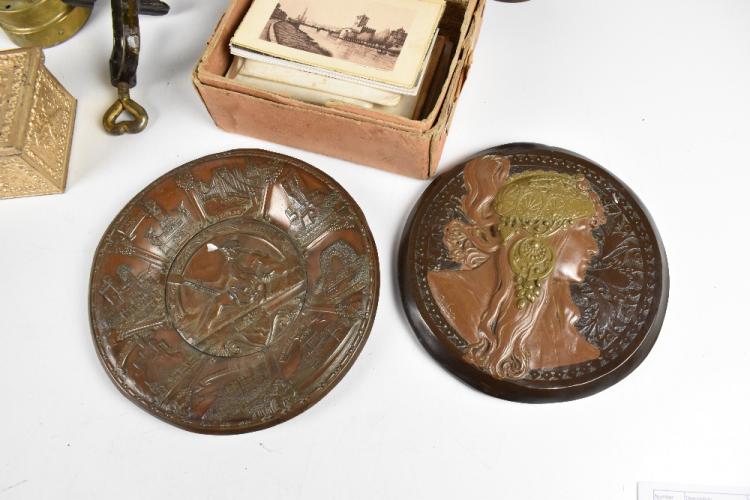 Lot 1492 of 2131: A small group of metalware including a circular plaque, a lamp, an oversized goblet, also a small collection of postcards.