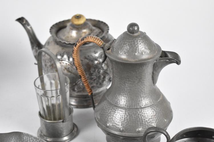 Lot 1502 of 2131: A group of assorted pewter items, including an Arts & Crafts style part tea service, tea canister, various trays, etc.