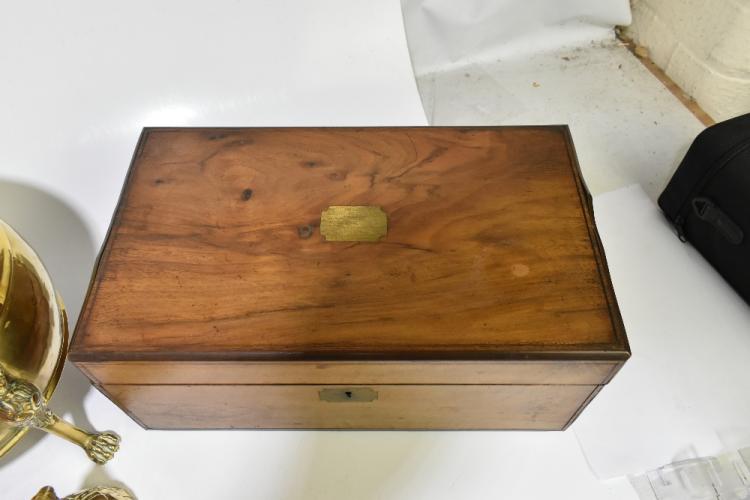Lot 1512 of 2131: A Victorian copper kettle, brass jardinière on legs, copper tray, small group of metalware and a Victorian walnut writing slope.