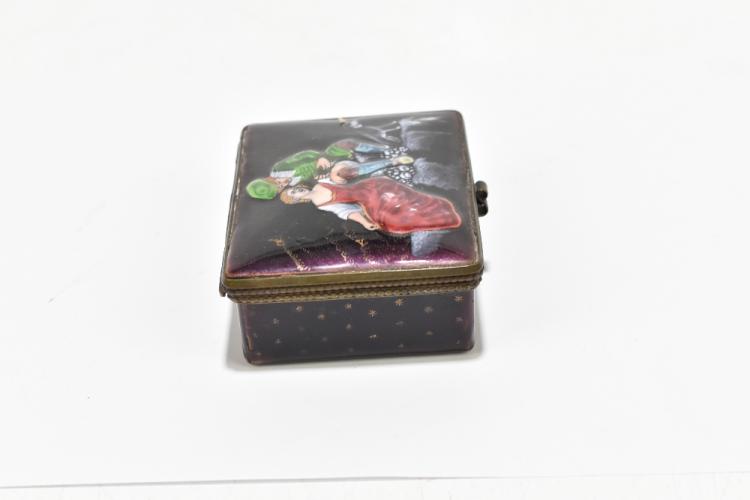 Lot 1550 of 2131: LIMOGES; an enamelled rectangular trinket box painted with a young couple beside their hound on a purple ground, the whole box with gilt star decoration on the same purple/aubergine ground, 8 x 6.5cm.