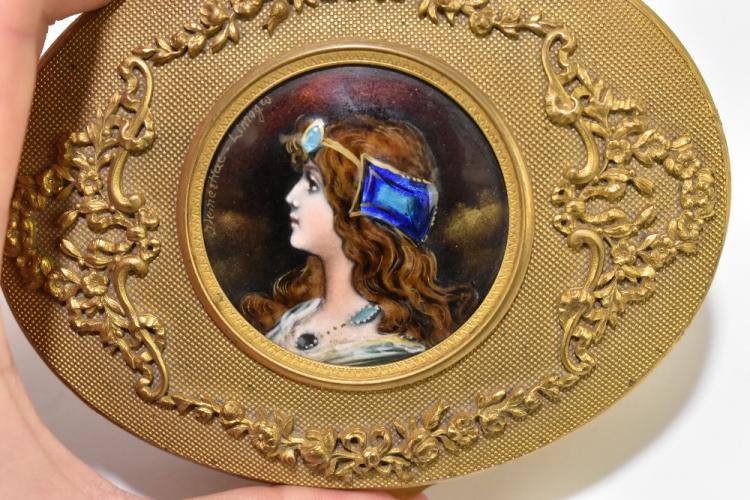Lot 1555 of 2131: DEMERLIAC FOR LIMOGES; a gilt metal oval casket, the hinged lid set with an oval enamelled plaque decorated with the profile portrait of a young woman, signed, width 12cm.