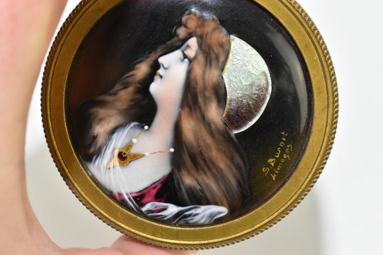 Lot 1564 of 2131: S. BURNOT FOR LIMOGES; a pair of circular gilt metal trinket boxes each pull off lid set with an enamelled circular plaque painted with the head and shoulder portrait of young women, both signed, diameter 8cm.