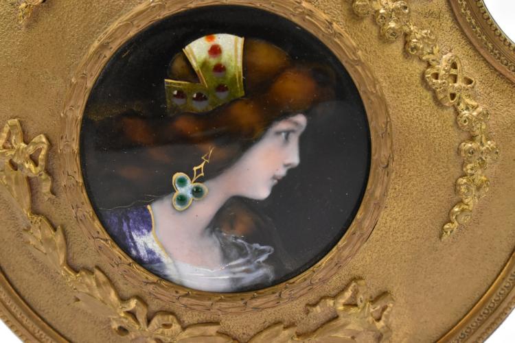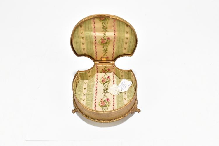 Lot 1565 of 2131: LIMOGES; a shaped gilt metal trinket box, the hinged lid centred with a circular jewelled enamel plaque painted with the head and shoulders profile portrait of a young woman with swag adorned decoration to the lid and raised on three pierced scrolling supports, width 15cm.