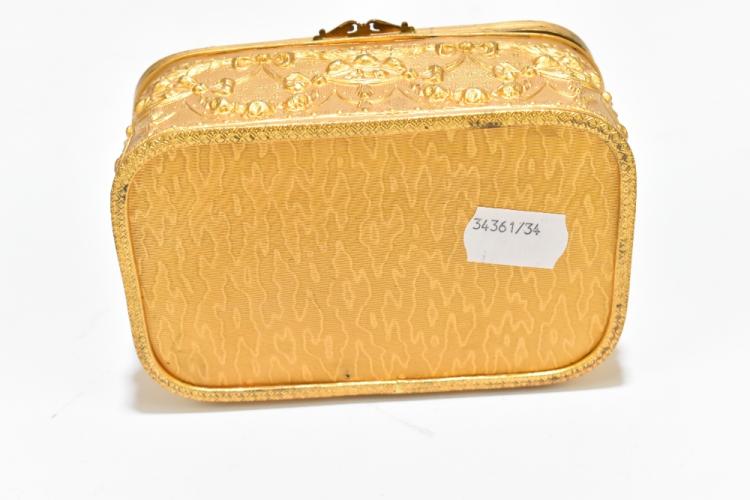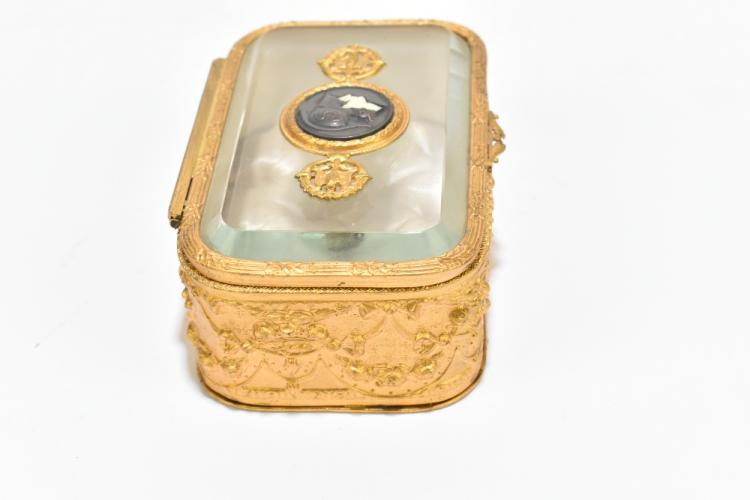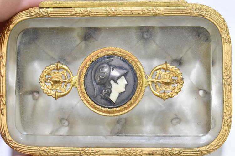 Lot 1569 of 2131: A circa 1900 French trinket box with hinged glass lid centred with a circular bronzed plaque depicting a Roman soldier and with elaborate swag adorned decoration to the base, width 13cm.
