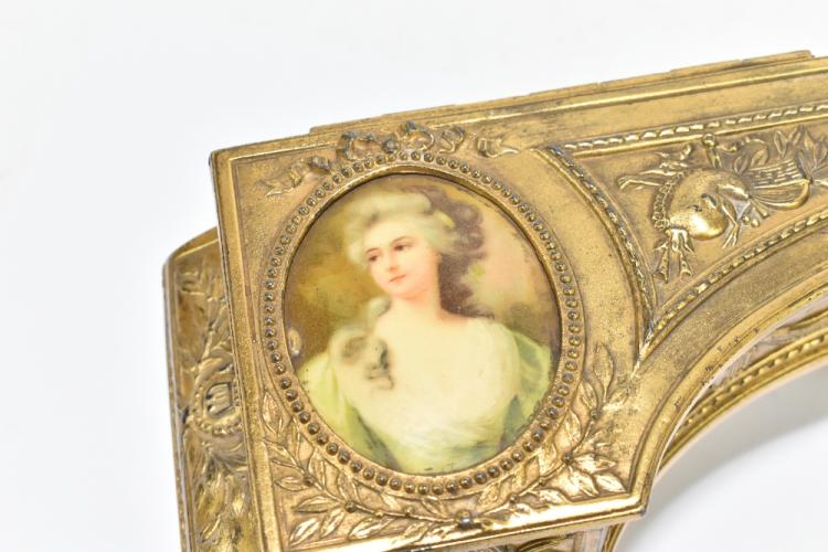 Lot 1570 of 2131: A novelty French gilt metal music box modelled as a grand piano, the hinged cover set with printed oval portrait enclosing a silk interior and raised on four supports, length 19cm.