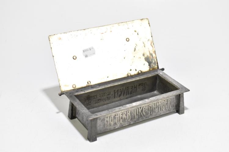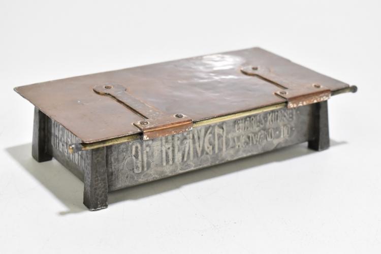Lot 1577 of 2131: An Arts and Crafts silvered copper and pewter box in the manner of A.E Jones, embossed 'There is no herb like it under the canopy of heaven, Charles Kingsley Westward Ho', length 21cm.