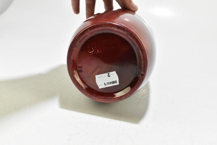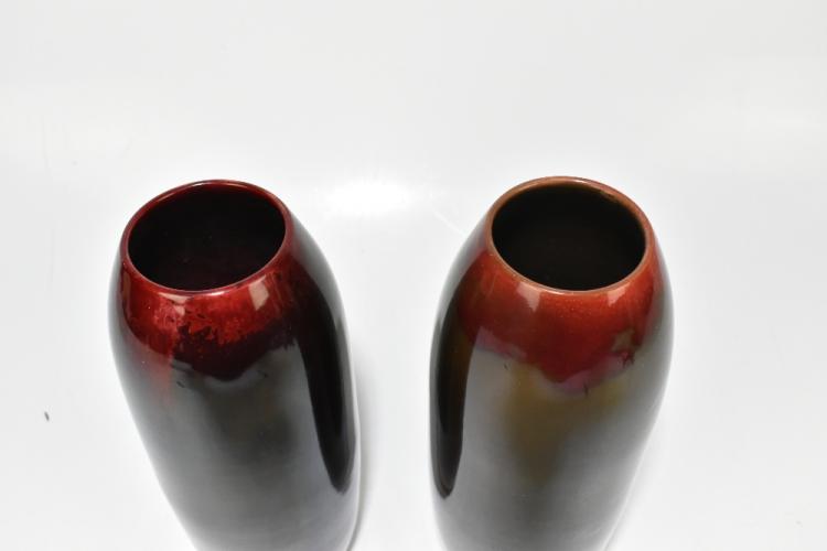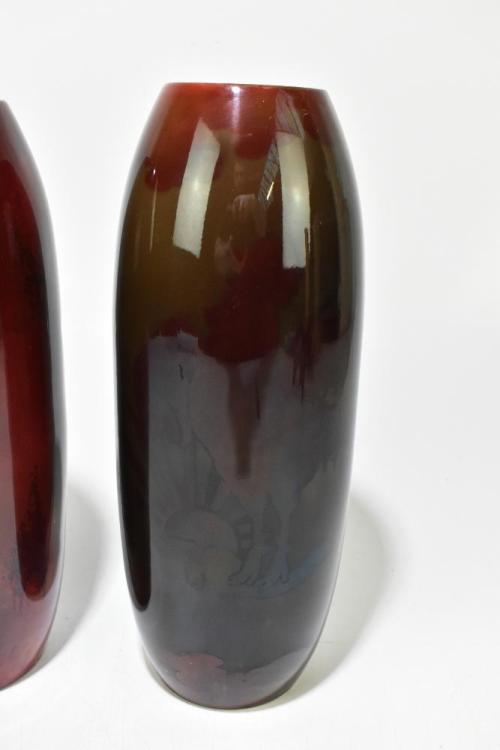 Lot 1584 of 2131: BERNARD MOORE; two flambé vases of cylindrical form, one example decorated with a part mythical beast and clouds, the other with mottled decoration, height of larger example 32cm (2).
