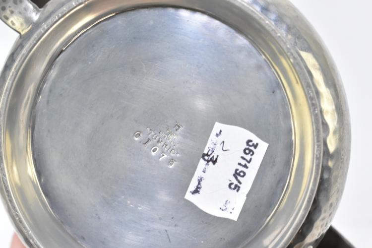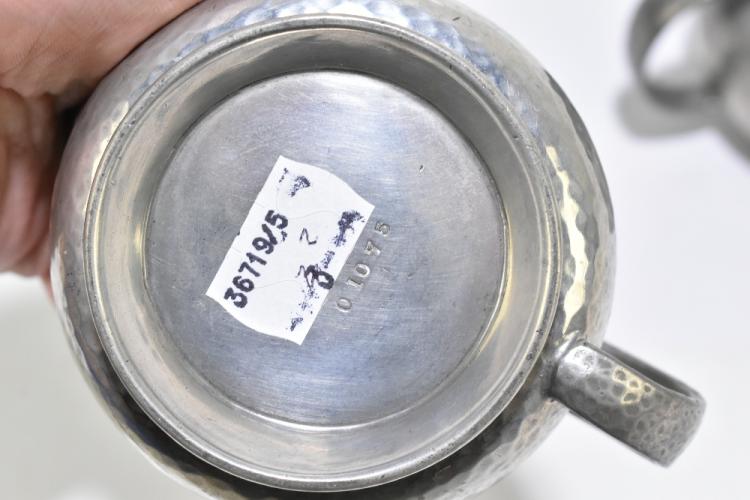 Lot 1585 of 2131: TUDRIC PEWTER; a twin handled sugar bowl and matching cream jug each with planished decoration, numbered 01075 (2).